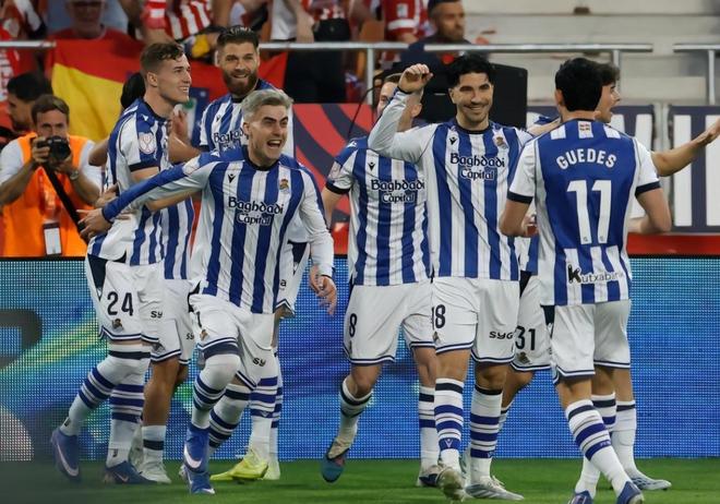 第24分鐘和第37分鐘皇家社會(huì)重炮手格德斯,連續(xù)完成高質(zhì)量打門,但都差一點(diǎn)準(zhǔn)星,皮球都稍稍偏出,非?;钴S的格德斯在半場結(jié)束前,禁區(qū)內(nèi)爭頂被撞翻,為球隊(duì)贏得一粒點(diǎn)球,奧亞薩瓦爾穩(wěn)穩(wěn)主罰命中,將比分改寫為了2-1,他也成為了國王杯124年歷史上,首位在2場決賽都打入點(diǎn)球的球員。