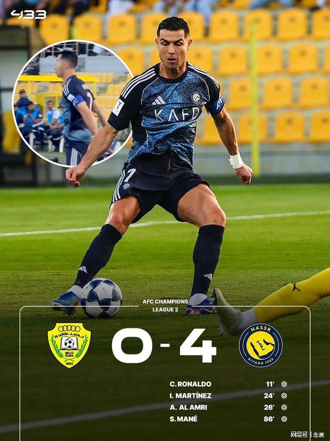 亞冠二級聯(lián)賽1/4決賽,利雅得勝利客場4-0迪拜祈禱,晉級四強。C羅推射破門,打入職業(yè)生涯第969球,菲利克斯雙響,伊尼戈-馬丁內(nèi)斯、阿姆里破門,馬內(nèi)錦上添花。